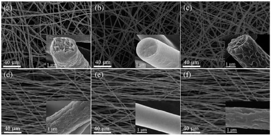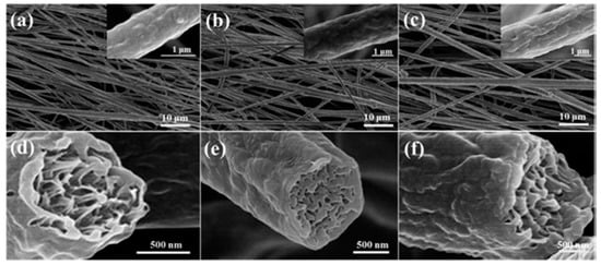 SEM images of aligned wrinkled electrospun PVDF fibers and their cross-section fabricated at different molecular weights. (a,d) Mw = 180 × 103. (b,e) Mw = 275 × 103. (c,f) Mw = 530 × 103. Reprinted with permission from [].