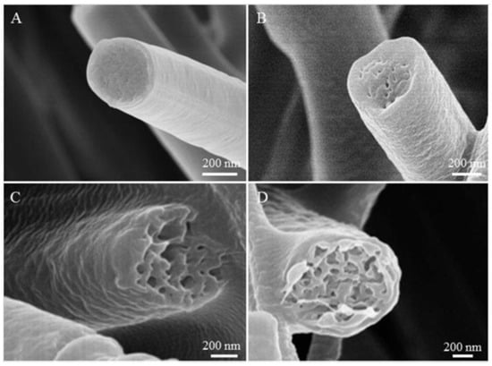 Cross-sectional SEM images of samples fabricated by electrospinning 35% (w/v) PVDF solution from DMF at different levels of relative humidity (A) 5%, (B) 25%, (C) 45%, and (D) 65%. Reprinted with permission from [].