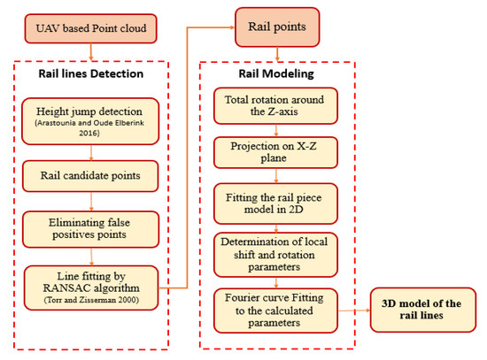 Our goal in this study is to detect and model railway lines using a colored point cloud obtained from the photogrammetric method. With the ability to capture images with high overlap and at low altitudes, UAVs make it possible to produce dense and high-resolution point clouds using the structure from motion (SfM) algorithm [25]. This algorithm identifies and matches the key points in the overlapping area in each pair of images taken from the study area. Then, using the iterative bundle adjustment algorithm, the relative orientation parameters of the cameras are calculated, and a sparse point cloud is created. Finally, the multi-view stereo (MVS) technique is employed to construct a dense point cloud [26]. This point cloud is used to model rail lines according to the proposed method illustrated in Figure 1.