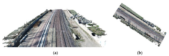 The data which are used here to evaluate the proposed method include UAV images from the Garmdareh region of the Alborz province in Iran and comprise about 200 m of railway lines. The images are taken using DJI Phantom 4 Pro with a sensor that can capture an image size of 5472 × 3648 pixels. The altitude of the flight is about 30 m. The ground sampling distance (GSD) of the images and also the point spacing of the generated point cloud are about 8mm. Due to the need for high ground resolution to identify rail lines, low flight altitudes are considered. The key points are first identified and matched using the scale-invariant feature transform (SIFT) operator in the overlapping parts of the images, and the relative orientation of the images is performed. Then, using the method of dense image matching with ground control points, the absolute orientation of the images is performed, and the dense point cloud of the region is generated, as shown in Figure 4. These steps are performed using the Agisoft PhotoScan software package [33].