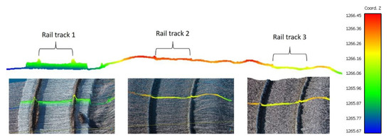 The first step is to identify the rail lines at the point cloud by height jump detection. There are three separate rail tracks existing in the study area next to each other. As we can see in Figure 5, which shows the cross section of the rail tracks, the area around railways 2 and 3 is almost fully covered by the ballast and, therefore, the rail lines are not “obviously” higher than the neighboring ground points. Accordingly, the number of detected rail points on these two tracks is minimal. So, detection and modeling, especially in these two railway tracks, is one of the challenges which we are facing in this research.