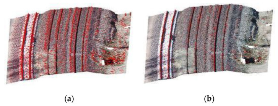 Accordingly, it is necessary to consider a small amount for the threshold of the height variation of each cell so that rail lines 2 and 3 can be identified. Based on data analysis, a 4 cm threshold is considered as a good value for the height difference between the points and the rail bed. Another important parameter at this stage is the size of the neighboring cells. This value must be set so that it does not contain two rail lines at the same time. It should also not be so small that it does not include the features needed to identify candidate rail points [34]. Given the standard gauge of railway lines [35] (1.435 m), here, we consider a value of 1 m for the number of cells. To calculate the “planarity” feature, the spherical neighborhood radius is selected in the same way. After the height jump detection, the false positive points are removed by adding the two conditions of intensity and planarity. Figure 6 shows the rail candidate points before applying these two conditions, in which the non-rail points are selected incorrectly due to the slope of the ground and a bulge in the rail bed. These points, which are incorrectly selected as rails, due to geometric similarities to rail tracks (being linear), cause trouble for line fitting in the next step. Figure 6b shows the results of the stage of identifying rail candidate points after applying the above two conditions.