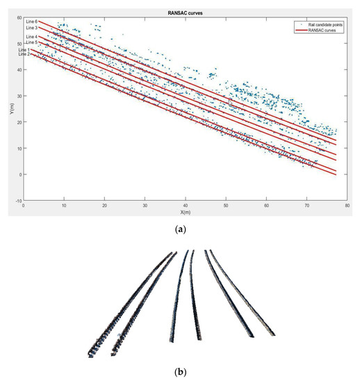 Result of curve fitting; (a) RANSAC polynomial and (b) rail tracks points.
