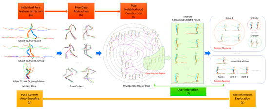 Illustration of the proposed approach for visual motion search. (a) With the input 3 motion clips, the individual pose features are extracted for each pose. (b) Data abstraction identifies large amount of almost same data and obtains 49 pose clusters. (c) Neighborhood construction casts the isolated representative 49 poses of clusters into a structure of phylogenetic tree for pose browse. (d) Each pose context is encoded into the compact latent space. (e) It is used to support online exploration including motion ranking and clustering after user locating the interesting region. (f) Various types of interactive operations such as zoom, pan and selection are available for pose browse and motion exploration.