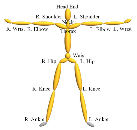 The distance of 3D coordinates of joints is numerical similarity measure and generally used to measure if two poses are very similar to each other. The skeleton models of different motion capture data may be different with each other. In our implementation, we convert these models to a unified one as shown in Figure 2. It contains 16 important joints and is enough to deduce if two poses are very similar. The limb length of different actors may vary greatly, so we need to choose a standard skeleton to normalize different actors’ motions. This is done by replacing each joint offset with the standard one and using the joint rotation to recalculate the 3D coordinates. In the direction normalization step, to make pose always be viewed as head-on, the waist of each pose is shifted to the origin of the coordinate system, and two hips are rotated around the y-axis to make it parallel with x-axis. After normalization, the 3D coordinates of correspond joints of different poses are comparable with each other, and they are extracted and input to the next step, i.e., unsupervised clustering.