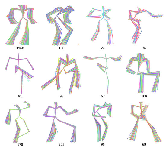 Some examples of data abstraction are shown in Figure 3, at the bottom is the number of poses in each cluster, ranges from 22 to 1168. The granularity of the results is commonly approved by users, while a fair number of poses need not to be shown by bypassing their direction, skeleton magnitude and motion context. We have implemented the proposed method on the dataset containing about 43 thousands poses. When the scalability of AP needs to be extended for huge data, we refer to the distributed version based on MapReduce [37]. The representative of each cluster is selected from actual poses, they will be input to neighborhood construction described in the next section.
