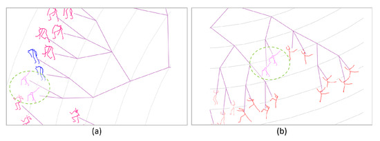 Part of two phylogenetic trees, (a) generated with 3D coordinates of joints, (b) generated by further merging 3 types of RGF.