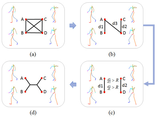Figure 7 illustrates the steps of generating a quartet with a given set of poses and one type of feature. (a) Select pose A, B, C, D from the set as 4 nodes, and connect these nodes with edges, the weight of each edge is the Euclidean distance of two connected nodes with the given type of feature. (b) Remove the largest 3 edges, then designate the 4th largest edge as the bridge and the smallest two edges as and respectively. (c) With the given threshold R, check if and . (d) If it fulfills the condition, a reliable quartet with its topological constraint is defined.