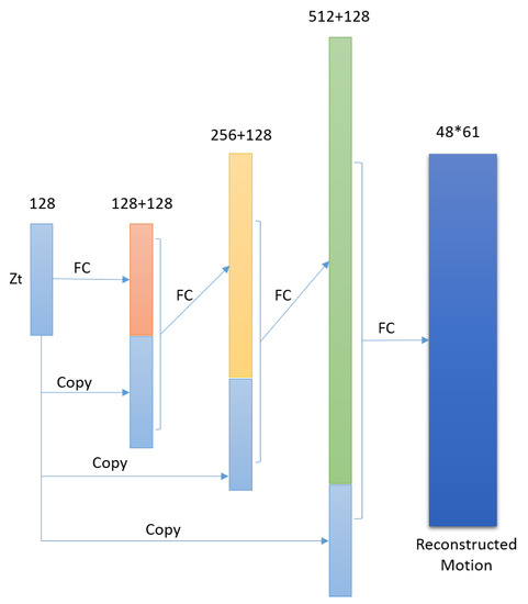 For each time step t, notice that the decoding target is not but the context motion which will be entitled to current pose. Previous 30 poses and future 30 poses are intercepted as the context motion for each pose, which duration is about 2 seconds and covers most actions. The decoding network is not based on LSTM as traditional LSTM auto-encoder. The reason is the latent representation of current can recovery the context motion with the aid of its neighbors. The decoding network is shown in Figure 11, the main components of which include copy, concatenation and full connection. The purpose of copy and concatenation is each layer can profit from the latent representation directly and make the learning progress faster.