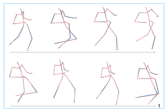 The training is implemented with this joint supervision of the motion reconstruction error and Euclidean distance on latent space of adjacent poses, and the detail of which will be present in Section 4.3. Examples of the original motion and reconstructed motion are shown in Figure 12. The motion is CMU’s motion capture data, trail 10 of subject 142, frame range from 290 to 509, the walk style is lavish, and the red line is the original pose in the motion, while the blue line is the reconstructed one. The average deviation is about 0.2 per joint. The offset from left hand to left forearm is 3.6, so there is very little difference between the original context motion and reconstructed motion.