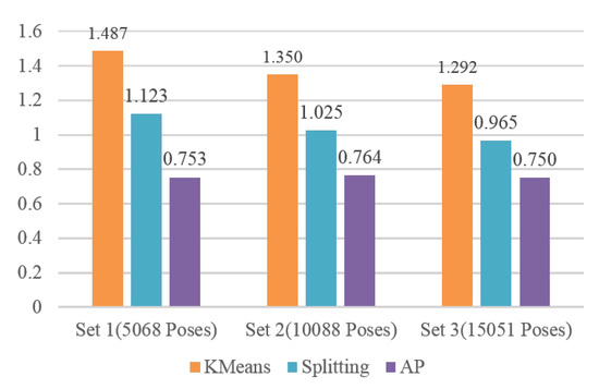 We selected three sets of motion clips from CMU’s motion capture database. The first set is composed of 5 clips from 01-01 to 01-05, where the first 01 is the subject ID and second 01 to 05 represent the motion clip index of subject 01, the total number of poses is 5068. The second set is composed of 10 clips from 01-01 to 01-10, the total number of poses is . The third set is composed of 20 clips from 01-01 to 01-14 and 02-01 to 02-06, the total number of poses is . For fair comparison, we first applied AP to each set and obtained 970, 2115 and 3515 clusters, respectively. This three numbers were input into KMeans as to specify the cluster number required by the algorithm. We also adjusted the distance threshold for Splitting to generate the same number clusters. The DBIs of three methods on three sets are given in Figure 13.