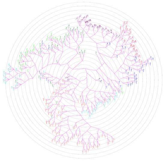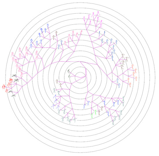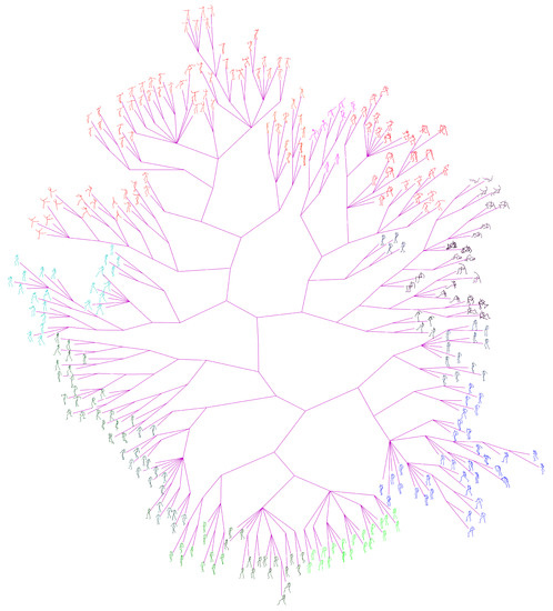 Figure 15 and Figure 17 present the phylogenetic trees corresponding to set #1 and #2 generated by our method WQMC. We compare it with KMeans [36], PCA [42] and neighbor joining (NJ) [43] three traditional approaches for visual browse and exploration. KMeans was adopted by MotionExplorer [10] to iteratively partition the poses to form a hierarchical tree. PCA is a parameterless method for dimension reduction and is often used in the visualization system [44]. NJ is a classical method to create a phylogenetic tree by bottom-up clustering. Moreover, our preliminary conference work [30] adopted QMC for neighborhood construction and is also compared. Just like MotionExplorer [10], we directly input 3D coordinates of joints into KMeans, and the same format is used for PCA. We use 3D coordinates of joints to calculate the distance matrix for NJ. For QMC and WQMC, 3D coordinates of joints and 3 types of RGF are adopted as feature representations. The iteration of KMeans is always set to to obtain the hierarchical trees.