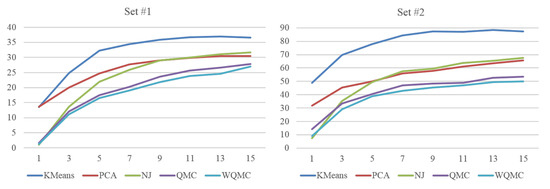 We adopt WQMC through quartets to further merge logical similarity measures for neighborhood construction. To verity the strength of the proposed approach, we compare the quality of the resulting phylogenetic trees generated with the subsets of 3 types of RGF and 3D coordinates of joints. The set of weight quartets created further using j types of RGF is denoted by . For example, when j is 2, the number of combinations is , so there are 3 elements in . For each element in and quartets generated from 3D coordinates of joints, we construct the tree with the Max-Cut optimization and the performance of which is calculated according to Formula (7). Figure 20 presents the results of different combinations on set and when the number of nearest neighbors s is 5. It indicates that the performance of our method is enhanced by further combing RGFs with 3D coordinates of joints. However, the growth becomes smaller and smaller with more and more types of RGF merged, and these 3 types of RGFs with 3D coordinates of joints are enough to get high quality neighborhood.