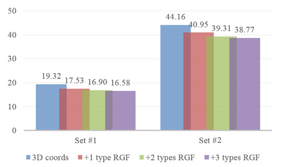 Average distance of combining different number of types of RGF with 3D coordinates of joints on set #1 and set #2, s is 5.
