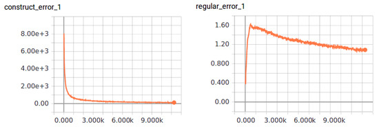 The proposed biLSTM-based auto-encoder is implemented by TensorFlow on the platform with GPU Tesla P100. There are 2605 motion clips in CMU’s motion capture database. We sub-sampled this data to 30 frames per second and separated them into segments with 160 frames, about 5 s. For each segment, we appended 30 frames to both ends as context. This results in total 7915 segments. It needs about 10,000 epochs for training. The learning rate is set to in the first 1000 epochs, then decreases linearly to minimum at epoch 8000. The change processes of average motion reconstruction error and regularization term of Euclidean distance on latent space of adjacent poses through training are shown in the left and right of Figure 22.