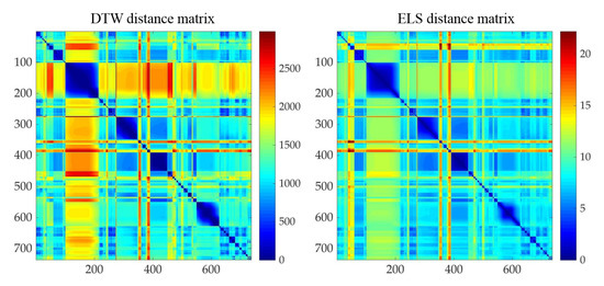 Distance matrices of motions relevant to set #1, left: DTW distance, right: ELS distance.