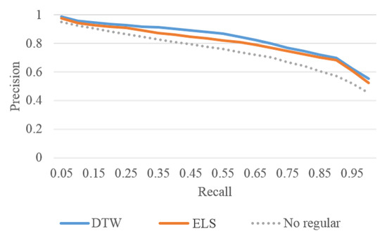 Recall-precision curves of three measures, i.e., DTW distance, ELS distance and ELS distance achieved without the regularization term.