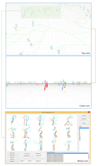 We have realized a prototype system on CMU’s motion capture data. The prototype system has three main 3D views as shown in Figure 28. The top is the tree view showing the neighborhood of all representative poses of clusters, which allows user to perform fast browse to understand the overview of the data collection and locate interesting poses quickly. The middle is the center view, in which the user selected poses are surrounded by other poses whose locations are determined by the edge counts to the selected one. It provides another means for user to implement quick comparison. The bottom is the motion view, which enables the user to perform fast online motion exploration with analysis tools for ultimate motion search.