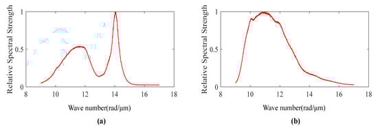 Using a spectrometer to measure the spectral intensity distribution of the Cree LED light source and Thorlabs halogen lamp light source that are often used in interferometers. Figure 2a,b show the spectral intensity measurement results of the LED light source and the halogen lamp light source, respectively. There are two peaks in the LED spectrum intensity distribution due to the physical properties of the light source, while the spectrum distribution of the halogen lamp is close to a single Gaussian peak, and there is only one main peak in the spectrum. Then, the spectrum distribution of LED light source is used to simulate the white light interference signal through formula (3), and the result is compared with the interference signal obtained in the actual measurement process, as shown in Figure 3. The two signals are similar in form, which shows the correctness of the signal simulation method and can reflect the nature of the interference signal of the system.