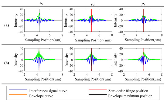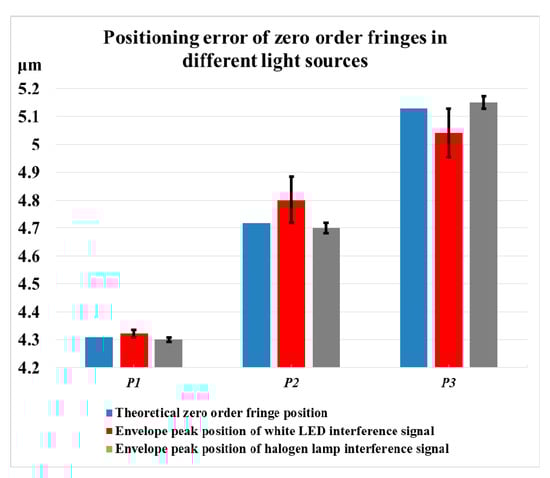 The influence of the depression and the secondary peak of the white LED interference signal on the extraction of the position of the zero-order fringes in the WLSI is simulated and analyzed. Based on the interference signal simulation method introduced in Section 2.1, the simulated experiment is to measure an inclined plane. In the experiment, three different measurement heights (P1, P2 and P3) are randomly selected at equal intervals, and the interference signal envelope peak positions of white LED and halogen light source are calculated, respectively, based on the traditional fast Fourier transform (FFT) envelope algorithm [19]. The simulation results are shown in Figure 5. It can be seen from the figure that the envelope curve of white LED interference signal is seriously affected by the depression and secondary peak, which results in the phenomenon of poor symmetry of envelope curve and multiple envelope peaks. The phenomenon is more obvious when the depression is closer to the zero-order fringe. At different heights, there is a jump change in the position of the main peak of the envelope, and the deviation from the center position of the theoretical zero-order fringe is large. Meanwhile, the curve of the interference signal of the halogen lamp has good symmetry, with an outstanding single-peak characteristic, and the deviation of the envelope main peak position from the zero-order fringe center position is small. The deviation of the envelope main peak position from the actual center position of the zero-order fringe will influence the positioning accuracy of the zero-order fringe position in the algorithm. As shown in Figure 6, the difference between the zero-order fringe center position and the actual position of the two light source interference signals is calculated by the FFT envelope algorithm. It is obvious that the zero-order fringe center position deviation calculated for white LED interference signal is large.