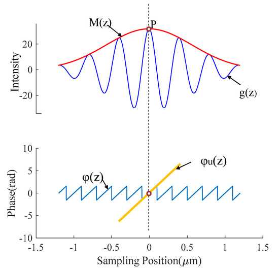 As shown in Figure 8, the zero point of the wrapped phase function φ(z) of the white light interference signal is located on the maximum value position P of the signal envelope M(z). So, P is regarded as the reference zero point used to unwrap φ(z), and the unwrapped phase function φu(z) after unwrapping is obtained. Taking P as the center, φu(z) is intercepted with N as the radius through Equation (8).