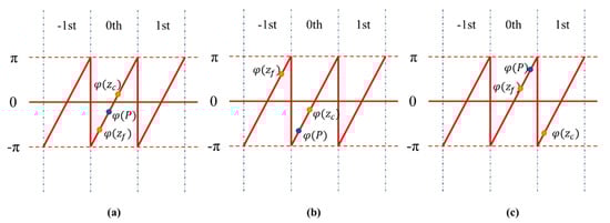 However, in the actual system measurement process, due to the influence of the spectrum characteristics of the white LED light source, the envelope curve of the interference signal at different surface heights will change greatly, which affects the accuracy of the reconstruction algorithm. This paper improves the algorithm for the problems existing in the LED WLSI. In the proposed algorithm, it is considered that the zero-order fringe position of the interference signal envelope obtained by the centroid method is relatively accurate. There will be no large deviation of the zero-order fringe positioning and the positioning deviation will not exceed the position of –1 and +1 order fringes. After the center position P is obtained by the centroid method, two phase values of two integer position points zf and zc close to P are taken from the wrapped phase function φ(z) to determine whether the phase values of the two points are in the same [–π, π] period. If it is in the same period as shown in Figure 9a, this paper considers that the surface calculation result of this point will be more accurate, and this point will be recorded as a stable point. If it is not in the same period as shown in Figure 9b,c, the reconstruction result of this point will have a greater probability of having large deviation, and this point is recorded as an unstable point. The classification of points will be used as the determinant for the selection of starting point in the subsequent surface correction algorithm.