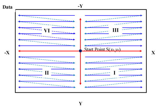 After finishing the correction of the surface on the X-axis and Y-axis with the starting point as the center, the data are divided into four parts according to the X-axis and Y-axis. According to the scan line path design strategies: X-axis direction first and from the center to the edge, the algorithm generates the path to traverse all data points. According to the surface correction judgment shown in Equation (10), the initial reconstruction surface is corrected by traversing each data point. In Figure 10, the data is divided into four areas, I, II, III and IV, with the starting point as the center. In each region, the region I algorithm corrects the initial surface along the scanning path from left to right, from top to bottom; in region II, it follows the scan path from right to left and top to bottom; and region III follows from left to right and bottom to top; lastly, region IV follows the scan surface path from right to left, and from bottom to top. The algorithm can complete the correction of the surface by only traversing all points one time, which ensures the calculation speed. At the same time, the data in the four regions can be calculated simultaneously by multiple threads without interfering with each other, which can further improve the operation speed of the algorithm.