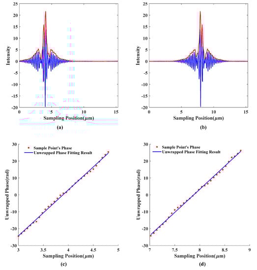 Figure 11 shows the information obtained in the solution process of the algorithm proposed in this paper. Figure 11a,b show the simulated interference signal and signal envelope at the step-down surface z0 = 4 μm and the step upper surface z1 = 8 μm, respectively. Figure 11c,d show the phase information of the signal obtained by the solution, take the maximum position of the envelope peak as the reference zero point to carry out phase unwrapping, and the phase of unwrapping is straight-line fitted by the least square method.