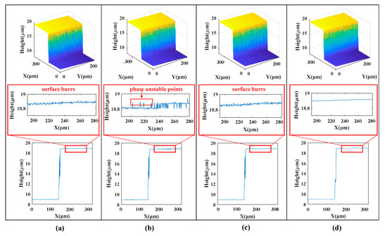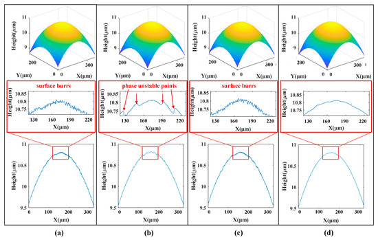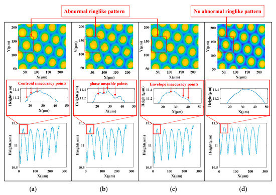 The measurement results of hexagon compound eye arrays are shown in Figure 14. As shown in Figure 14a–c below, the two-dimensional profile at the same cross-section position is not ideal. There are obvious rough points in the measurement results of the profile, the surface profile is not smooth and there are surface fluctuations similar to the abnormal ringlike pattern. The effect of the proposed algorithm is shown in the Figure 14d below, it can be seen that the algorithm proposed in this paper can effectively improve the quality of surface measurement, and solves the problems of surface burrs, residual abnormal ringlike pattern and phase unstable points on reconstructed surface, which cannot be accomplished by traditional white light interference algorithms. The algorithm proposed is not affected by the uneven contrast of the interferogram caused by the white LED, it can effectively realize the surface reconstruction of VSI measurement data of continuous surface or freeform surface periodic structure under LED light source, which proves that the algorithm has high feasibility.