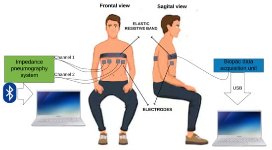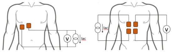 Changes in chest electrical impedance caused by respiration can be measured using either a two-electrode (bipolar) or a four-electrode (tetrapolar) configuration [26,41], as shown in Figure 1.