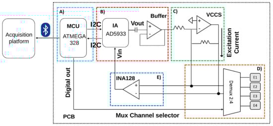The hardware used to acquire the TEB variations are divided into three stages, considering performance and safety considerations [38,39,42,43]: control, excitation signal generation, and distribution and acquisition. A general diagram of the proposed design is shown in Figure 2.
