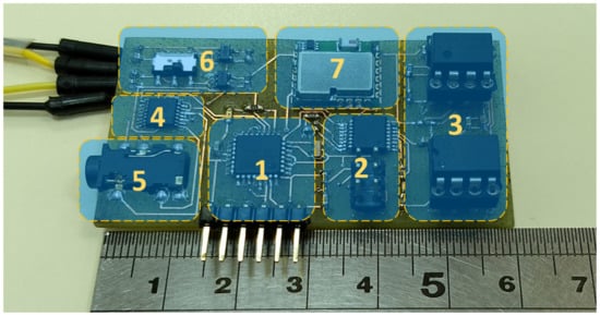 Figure 3 shows the implemented PCB for the TEB device. The system is composed of (1) a ATmega328 microcontroller, (2) a AD5933 impedance analyzer, (3) an analog front-end stage, (4) a dual-channel analog multiplexer, (5) a bioimpedance electrodes connector, (6) a ±3 V dual voltage regulator, and (7) Bluetooth 3.0.