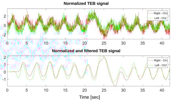 Normalized and unfiltered TEB variation signals from both channels (upper) and filtered and normalized TEB variation signals from both channels (lower).