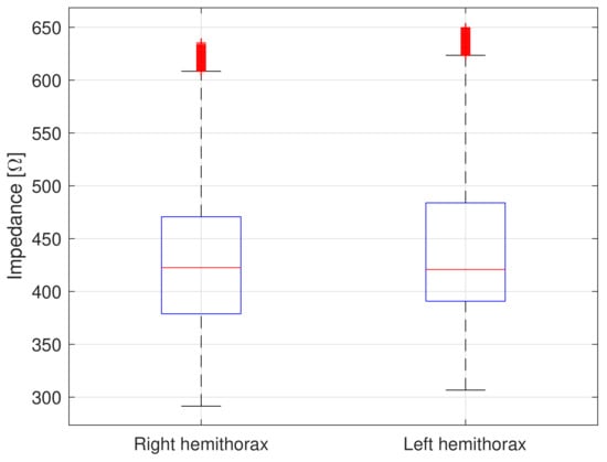 Regarding the TEB values obtained from the measurements in the test subjects, Table 1 shows the values of the mean (), standard deviations (σ), and the minimal (Min) and maximal (Max) values obtained in Ω, separated by right and left hemithorax.