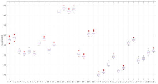 The highest impedance was obtained on the left side of the thorax (446.4 ± 2.3 Ω), compared to the right side of the thorax (437.4 ± 2.6 Ω). This behavior is not hardware-induced as the measurement protocol involved switching the channels and acquiring a second record for each subject. The influence of the heart in the left hemithorax or the fact that the right lung has three lobes and is slightly larger than the left lung with two lobes could explain these results. Notably, only three of the 15 subjects had a higher average impedance on the right side of the body (see Figure 12). This may be due to various factors, such as the electrodes location, inadequate cleaning of the measurement area, or poor electrode adherence on the subject’s skin.