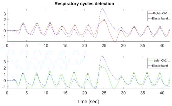 The acquired signal allows estimating lung volume parameters related to the mechanical expansion and retraction of the thorax, which could allow estimating other physiological parameters such as tidal volume [47]. The proposed TEB device identifies the lung variations from both the right and left ventral sides of the thorax and can measure the respiratory frequency (Figure 14).