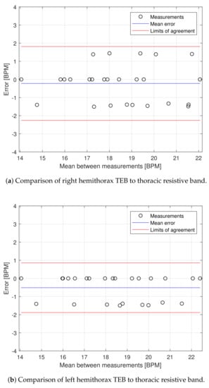 The respiratory frequency of each hemithorax is compared to the resistive band reference in breaths per minute (BPM) to generate a Bland–Altman plot, shown in Figure 14.