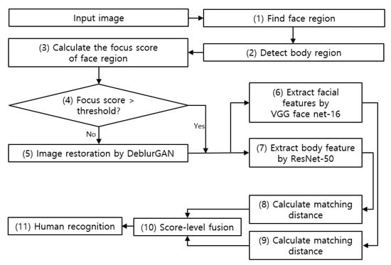 Figure 1 shows the overall configuration of the system proposed in this study. A face image is obtained from the original image acquired in an indoor environment (step (1) in Figure 1). A body image is obtained from the original image excluding the face image (step (2) in Figure 1). The focus score of the face image is calculated (step (3) in Figure 1). An image exhibiting a focus score value of less than the threshold (step (4) in Figure 1) undergoes restoration using DeblurGAN (step (5) in Figure 1) and is combined with images exhibiting a focus score value that is greater than or equal to the threshold. The restoration of body image via DeblurGAN is conducted in the same manner. Image features of face and body are extracted by applying a CNN model to the image combined from the restored face and body images and the image with a focus score greater than or equal to the threshold (step (6) and (7) in Figure 1). The authentic/imposter matching distance is calculated using the feature vectors obtained above (step (8) and (9) in Figure 1). The score-level fusion is conducted using the matching distance (step (10) in Figure 1). The weighted sum and weighted product methods were for the score-level fusion in this study. The final recognition rate was measured using score-level fusion (step (11) in Figure 1).