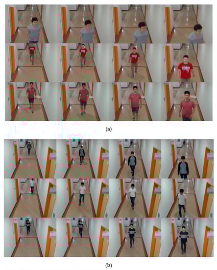 Two types of cameras were used in this study to acquire the DFB-DB2. The cameras were Logitech BCC950 [28] and Logitech C920 [29]. The cameras were also used for Dongguk face and body dataset version 1 (DFB-DB1). There was no difference in the scenario used for DFB-DB2 and DFB-DB1 in the study [9]. Furthermore, the DFB-DB1 only consists of images above the threshold based on the method of an extant study [10]. However, the DFB-DB2 used in this study included images below the threshold that were restored with DeblurGAN. Figure 3 shows the scenario of the images with respect to DFB-DB2. In the figure, (a) shows the images acquired via the Logitech BCC950 camera, whereas (b) shows those acquired via the Logitech C920 camera.