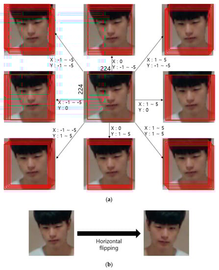 As shown in Table 4, data augmentation was performed only in the training data, whereas the original non-augmented data were used as test data. The number of test data points for the DFB-DB2 is less than that of the ChokePoint dataset, which is an open dataset, and therefore center image crop was performed during augmentation. The cropped image was applied with image translation and cropping for five pixels in top, bottom, left, and right directions. Furthermore, the image was horizontally flipped (mirroring). The training data that was processed accordingly included 440,000 augmented images from sub-datasets 1 and 2. For the ChokePoint dataset, after performing center image crop, image translation and cropping were applied for two pixels in top, bottom, left, and right directions. Furthermore, horizontal flipping was applied to obtain images that were magnified by 50 times. The sub-datasets 1 and 2 in Table 4 include a total of 1.03 million augmented images. Figure 5 shows the data augmentation method used in this study.