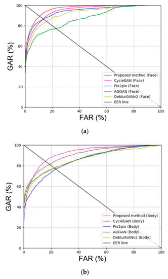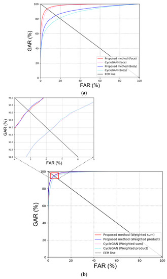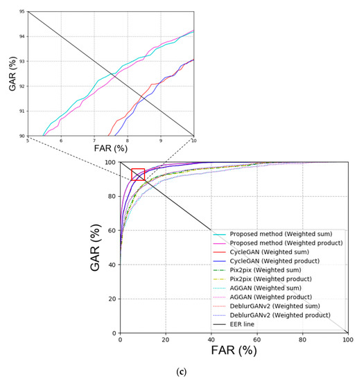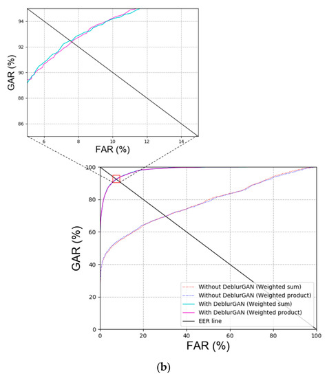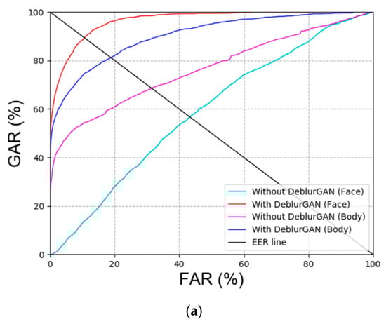 As shown in Figure 7, the performance of ‘with DeblurGAN (Face)’ and ‘with DeblurGAN (Body)’ was improved. Face and body refer to face images and body images, respectively. Based on the score-level fusion approach, the weighted sum method exhibited a better performance than the weighted product method.