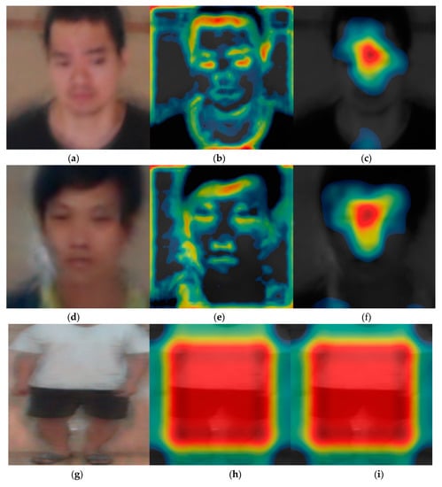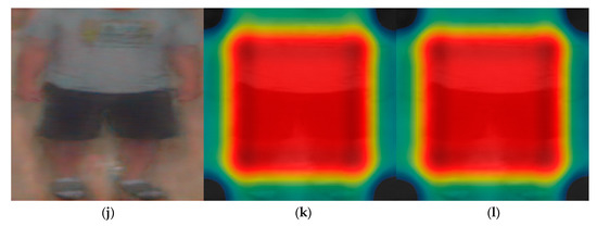 In the subsequent experiment, the class activation feature map of the ChokePoint dataset was examined. Figure 20 shows the class activation feature map results. The face image signifies the class activation feature map obtained from the ReLU layer of VGG face net-16. Figure 20h,i,k,l of Figure 20b,c,e,f body image represent the class activation feature map of the image that passed through the batch normalized layer. In the result of the images, the red color represents the main feature, and the blue color represents less important features. Similar results to the experiment using DFB-DB2 are obtained in Figure 20.