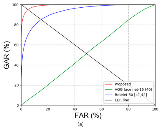 Second, the experiment was conducted to compare face and face and body recognition. The experiment to compare face recognition was conducted with VGG face net-16 [40] and ResNet-50 [41,42]. Multi-level local binary pattern (MLBP) + PCA [43,44], histogram of gradient (HOG) [45], local maximal occurrence (LOMO) [46] and ensemble of localized features (ELF) [47] were used for the experiment to compare face and face and body recognition. Table 8 summarizes the comparison results of face recognition, and Table 9 summarizes the comparison results of face and face and body recognition. Figure 9 shows the receiver operating characteristic (ROC) curve of the results in Table 8 and Table 9.