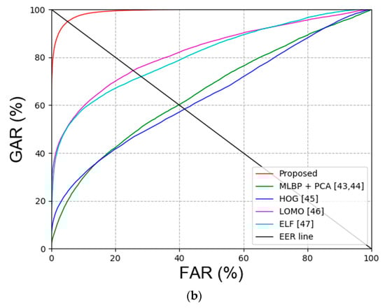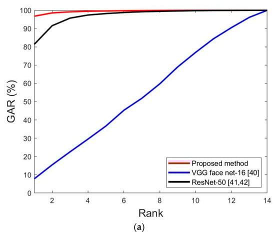 Figure 17 shows the comparison of the CMC curve of the proposed method and previous methods for face and face and body recognition. As shown in Figure 17a,b, the performance of the proposed method exceeded that of other methods.