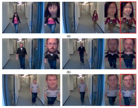 Cases corresponding to false acceptance (FA), false rejection (FR), and correction recognition (a)–(c) Cases from ChokePoint dataset (a) FA cases, (b) FR cases, and (c) cases of correct recognition.