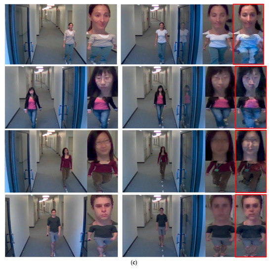 The ChokePoint dataset is provided at no cost by National ICT Australia Ltd. (NICTA) and consists of Portal 1 and 2. Portal 1 contains 25 individuals (19 males and 6 females), and Portal 2 contains 29 individuals (23 males and 6 females). A total of three cameras were used from six locations to constitute the dataset. The dataset of the study [9] was maintained. Furthermore, the images considered exhibit a blur, based on the threshold value in an extant study [10], were restored with DeblurGAN and included for evaluating the recognition performance. Figure 4 shows the examples of the ChokePoint dataset.