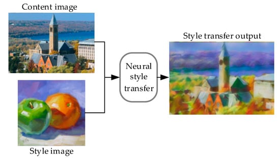 Style transfer seeks an artistic style reproduction on daily photos, enabling the photos retain the original content while presenting a prescribed artistic style [,,]. The artistic style generally includes the color style and the texture style. By convention, the daily photo in style transfer is called content image, while the image who renders the artistic style is the style image. Style transfer makes artistic creation no longer distant for most people []. The process of neural style transfer is showed in Figure 1. The traditional artistic stylization algorithms are related to an area called non-photorealistic rendering (NPR), most of which transfer particular artistic styles [,]. In recent years, the development of deep learning [,,] has made a breakthrough in style transfer [,,,]. The neural network enables the extraction of artistic styles, which makes it easier to convert daily photos into artistic photos []. For example, Gatys et al. [] use the convolutional neural network (CNN) to reconstruct the content and style, and optimize the stylized image iteratively based on a loss function. From then on, CNN-based neural style transfer has become a hot topic [,,,,].