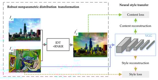 To solve this problem, a neural style transfer model based on robust nonparametric distribution transfer is proposed. Before the style transfer, the color of the style image is transferred into the content image. This method is named robust nonparametric distribution transferred neural style transfer, which is shown in Figure 2.