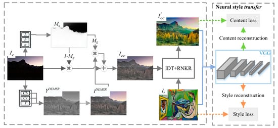 Figure 3 shows the proposed EC-RNDT neural style transfer model combining adaptive DEMSR algorithm and RNDT algorithm. The exposure correction and color distribution transform include three steps. The first step is an automatic detection of whether the image is underexposed. Second, the light restoration and the enhancement of edge details are performed. Finally, the exposure correction image is input into the RNDT model.