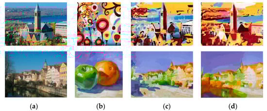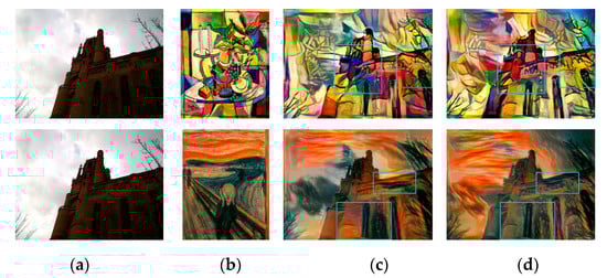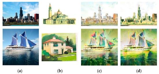 The stylized results of Gatys et al. [] and EC-RNDT model are shown in Figure 15. As shown in the green box, the stylized results of Gatys et al. loose some details in the building, resulting in an ambiguous structure of the building. Comparing Figure 15c,d, it is easily found that the EC-RNDT model can render the color and preserve the structure better. It can be attributed to exposure correction preforming before the style transfer, which can learn and preserve the fine details in the backlit region well.